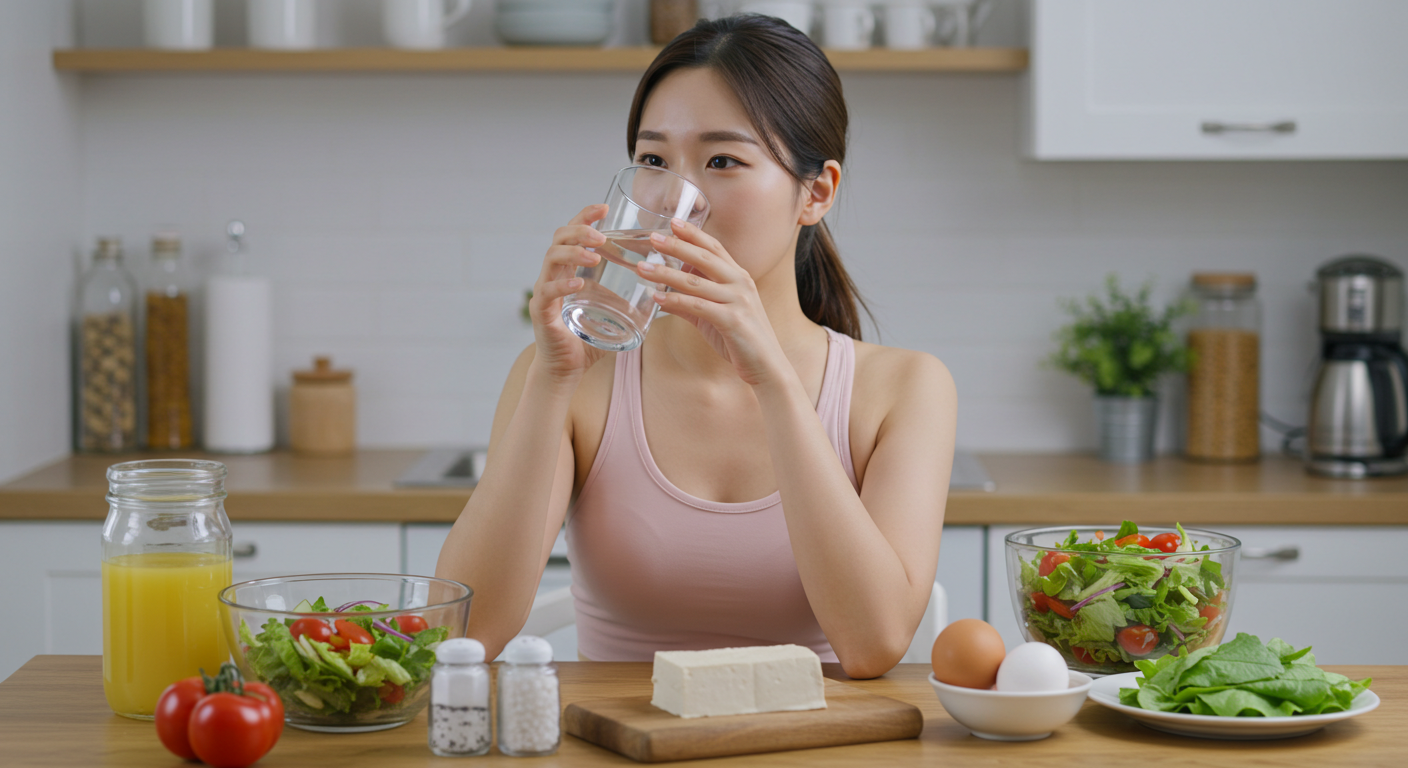 다이어트 중에도 단백질을 충분히 섭취해야 처짐 없는 턱선을 만들 수 있습니다.